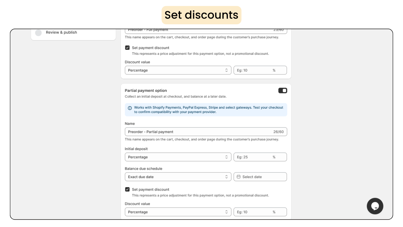 - Under the Shipment & Payment section, you can set discounts separately for Full Payment and Partial Payment options.